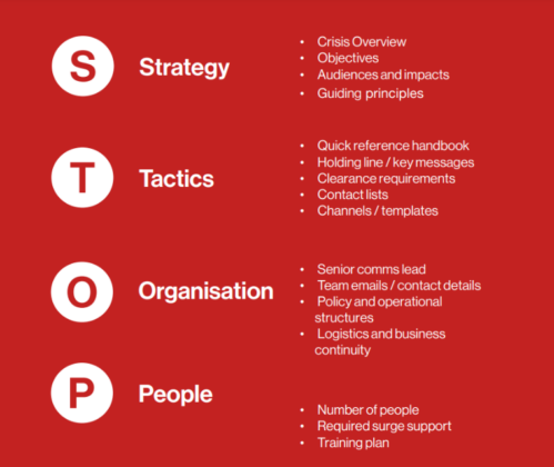 The STOP template sets out the key elements of a robust crisis communications plan: