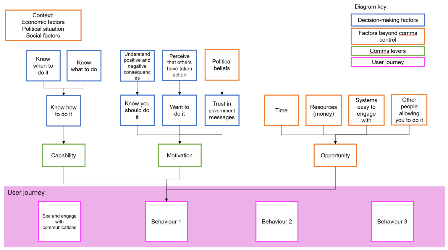 According to the COM-B model, in order to do a behaviour an individual must have the Capability to do it, the Motivation to do it, and external factors must provide the individual with an Opportunity to do it (see reference 3).